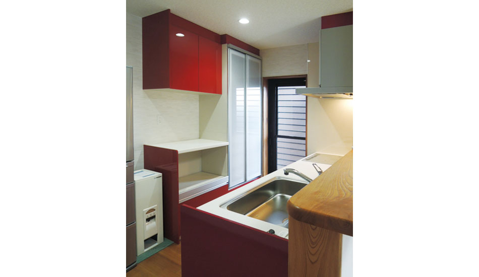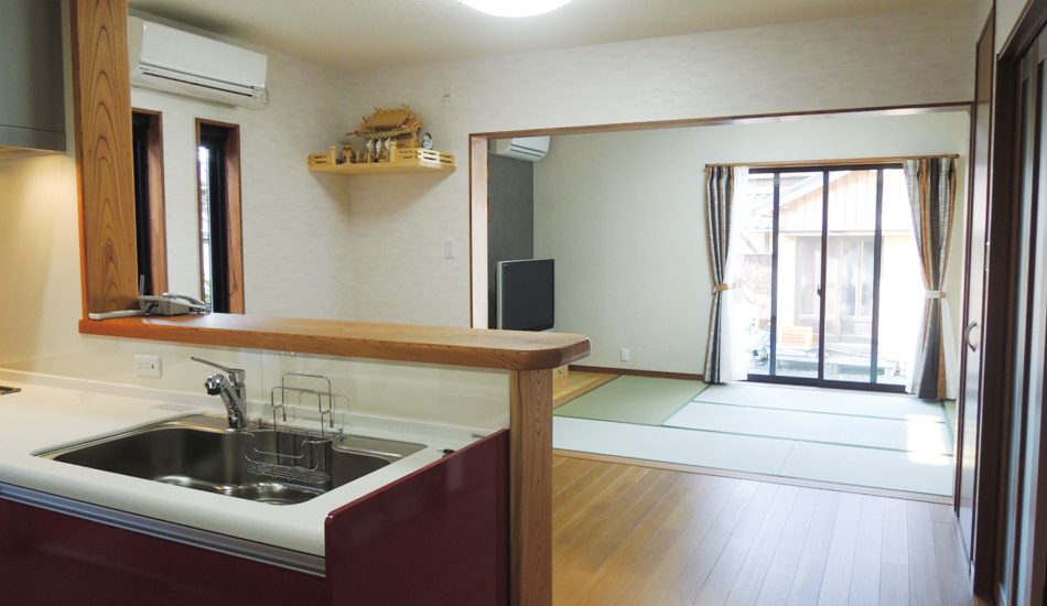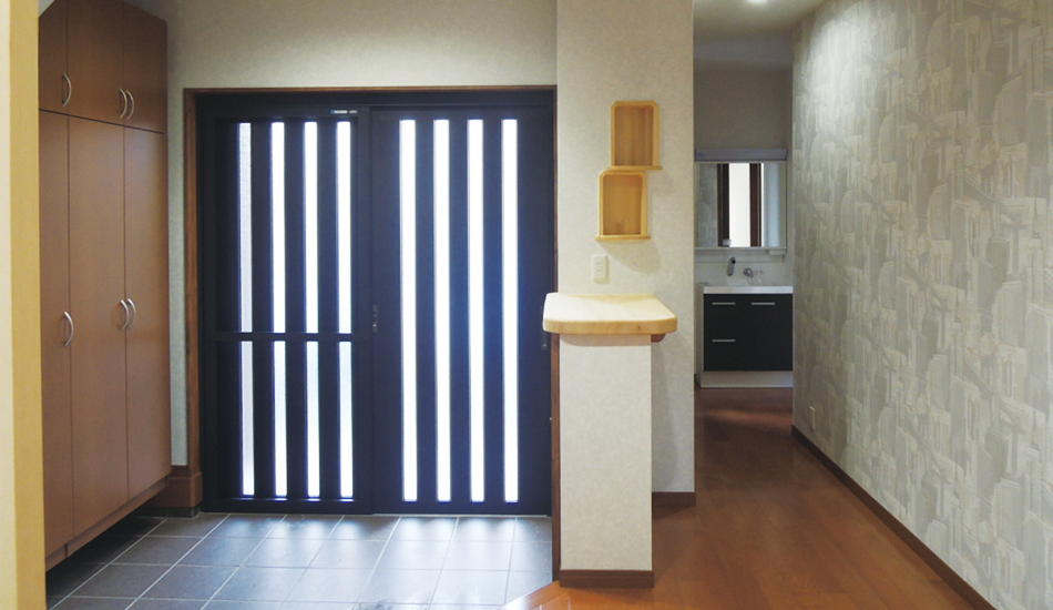 仏壇のある座敷とリビングを一つの空間にしています。玄関には容量いっぱいの収納棚を設け、生活動線を意識した住みやすい間取りになっています。