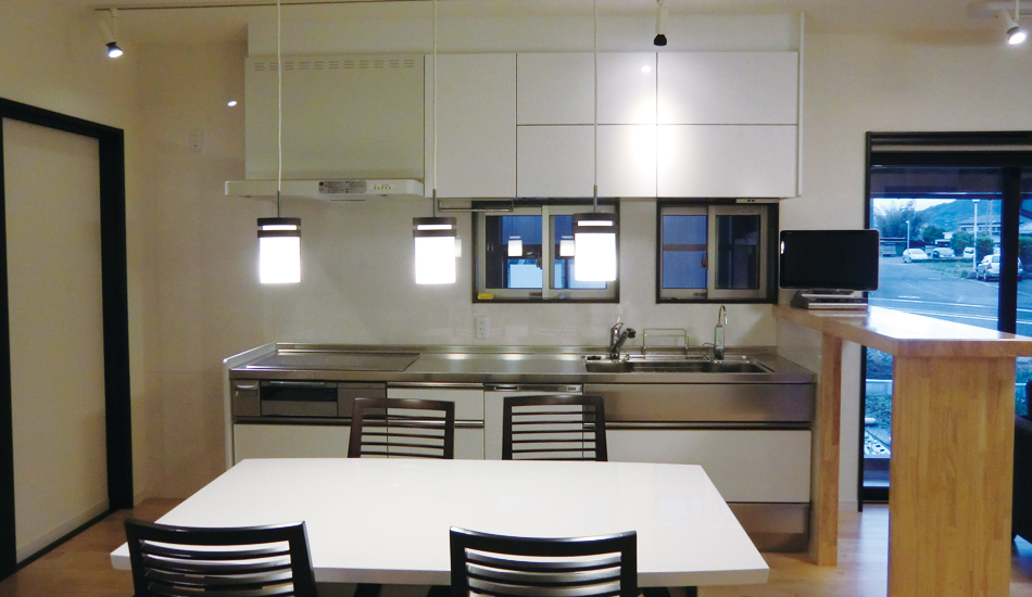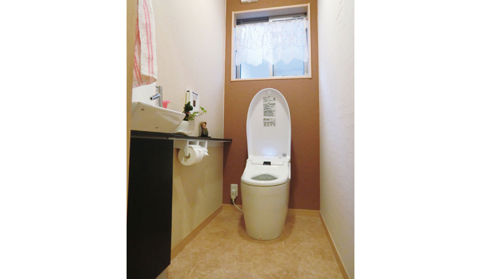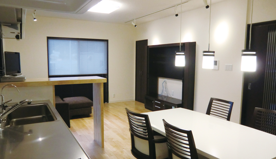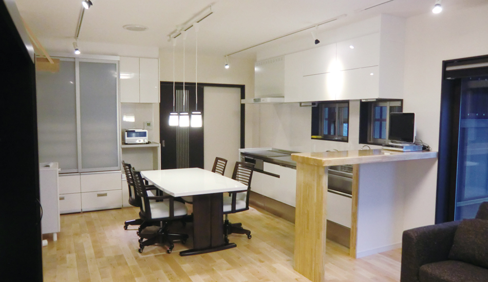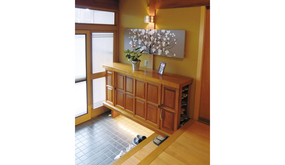 玄関の壁には奥様のご希望で円のはめ込み壁にし、ご夫婦の寝室を1Fにして家事動線も便利にリフォーム。LDK.キッチン、トイレ、洗面台、床はフラットにしています。