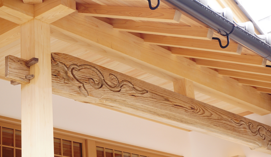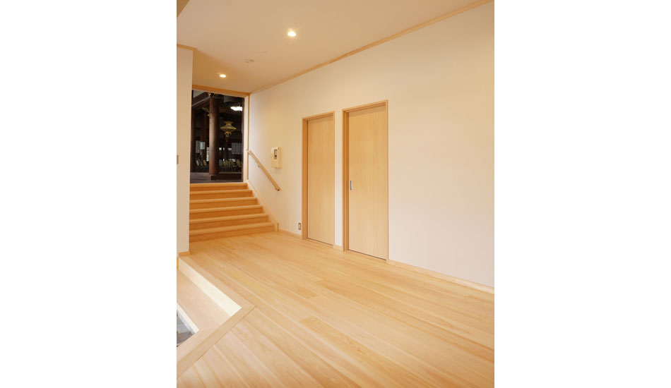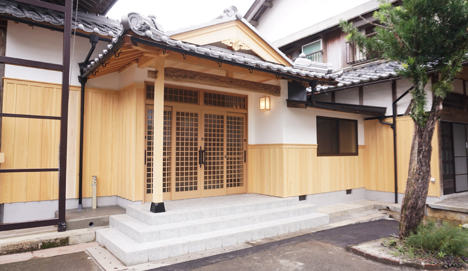 玄関から拝殿に向かう廊下を全面檜張にし、トイレ全般・外壁も改修しました。向拝は一度取り外し、弊社作業で修繕後に、再度現場で組み直しました。